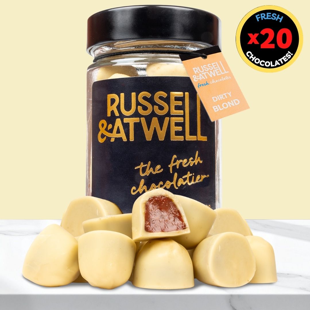 Our best selling Dirty Blond Chocolate. A white chocolate shell with a dreamy, creamy milk chocolate centre.